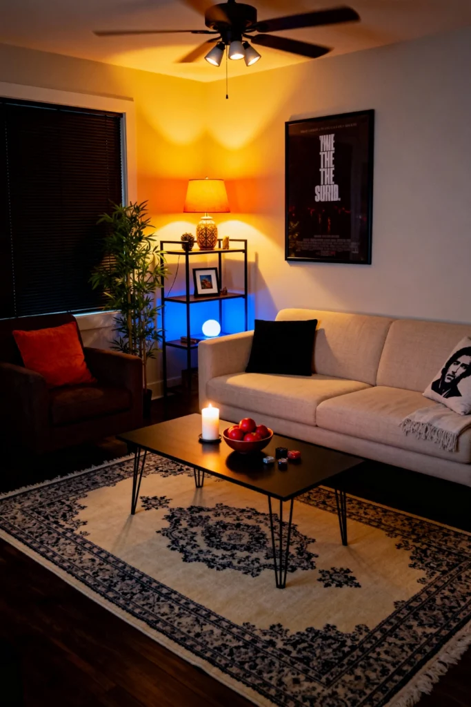 Set a moody, cinematic tone with a mix of lighting. Place a warm amber lamp on an open shelving unit and pair it with a cool blue accent light on the shelf below. Choose a simple beige sofa and a dark, plush armchair for comfortable viewing. Lay down a traditional, bordered cream and navy rug. Add a sleek, black hairpin-leg coffee table in the center. Hang a large, dark framed movie poster on the wall to complete that home-theater aesthetic.