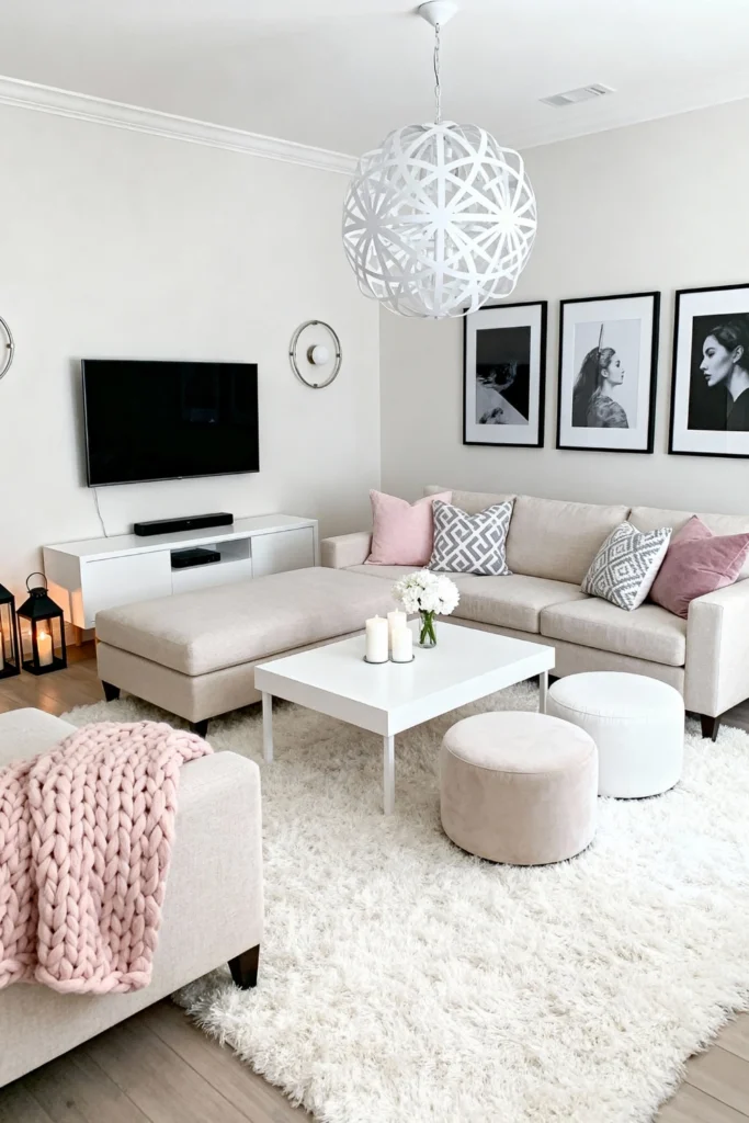 Choose a spacious, light beige sectional to maximize your seating area. Layer a chunky, oversized pink knit blanket over the arm for an extra dose of coziness. Lay down a plush, white shag rug that feels like a cloud underfoot. Hang three large, black-and-white portraits above the sofa to add a sophisticated, modern edge. Center the space with a simple white coffee table and matching poufs. Install a statement geometric white pendant light to tie the airy vibe together.