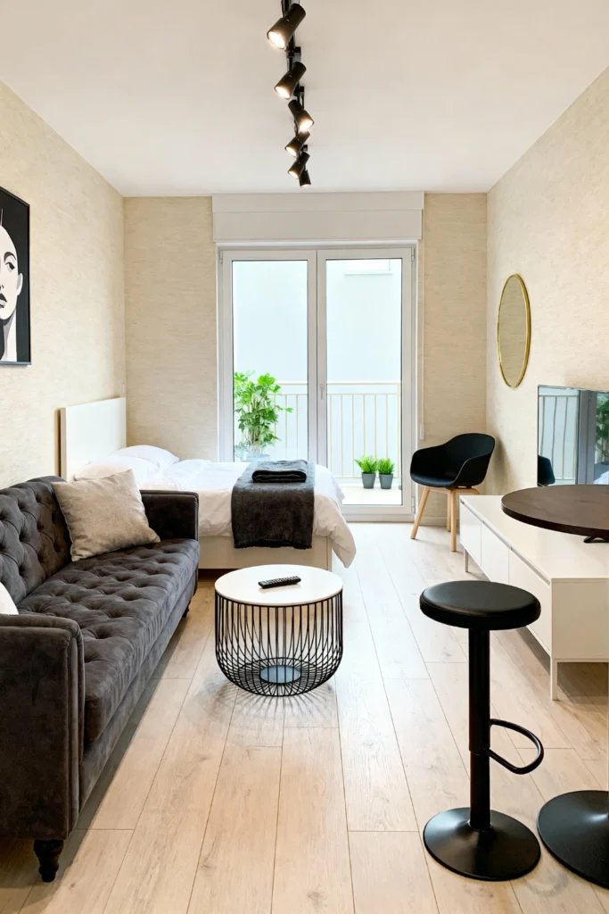 Maximize your studio space with a handsome gray tufted sofa. Place a delicate wire-frame coffee table in front of it to keep the sightlines open. Tuck your cozy bed neatly near the balcony doors to catch the morning light. Use a low white console under your TV to store essentials without overwhelming the room. Add a tall, black barstool and a high table to create a smart, space-saving dining area. Hang a simple round mirror to reflect light and make the room feel bigger.