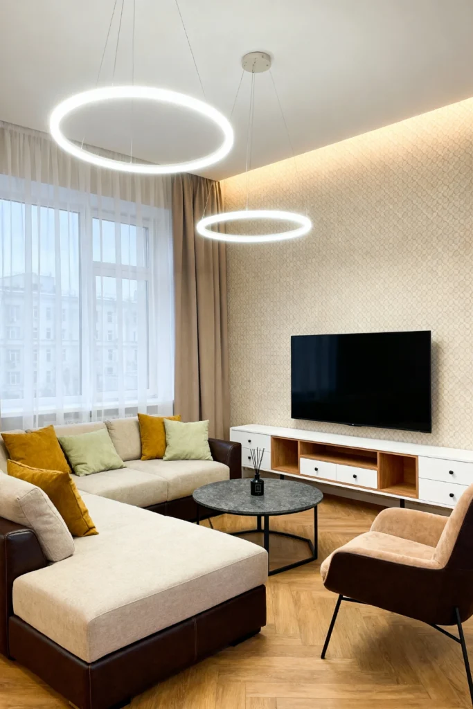 Pick a large, two-toned sectional in beige and dark brown for a grounded, comfortable seating area. Toss on a mix of mustard and soft green pillows for a subtle pop of earthy color. Hang striking, oversized circular LED pendant lights to instantly modernize the ceiling space. Add a round, stone-look coffee table to break up the straight lines of the furniture. Use a low, white and wood-toned TV stand for a clean, Scandinavian-inspired storage solution.