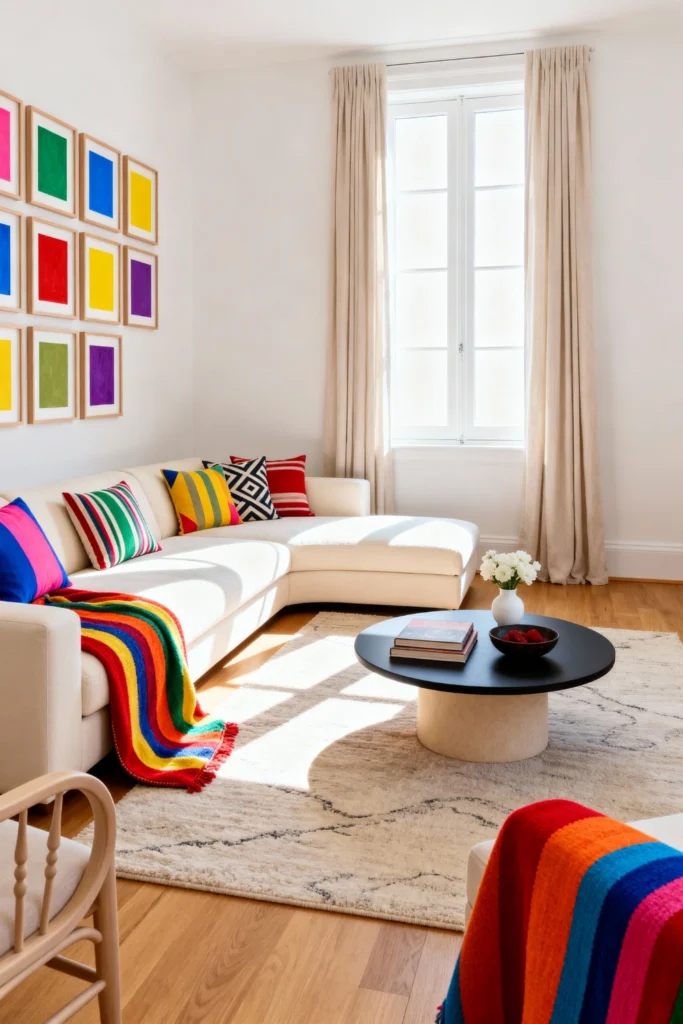 Brighten up a pure white room with a sleek, cream-colored sectional. Drape a bold, rainbow-striped blanket over the edge for an instant mood booster. Toss on a few graphic and colorful throw pillows to match the vibe. Create a perfectly aligned gallery wall using solid, bright-colored squares in matching wooden frames. Place a low, black round coffee table in the center to ground the floating colors. Top it with a simple white vase and fresh blooms.