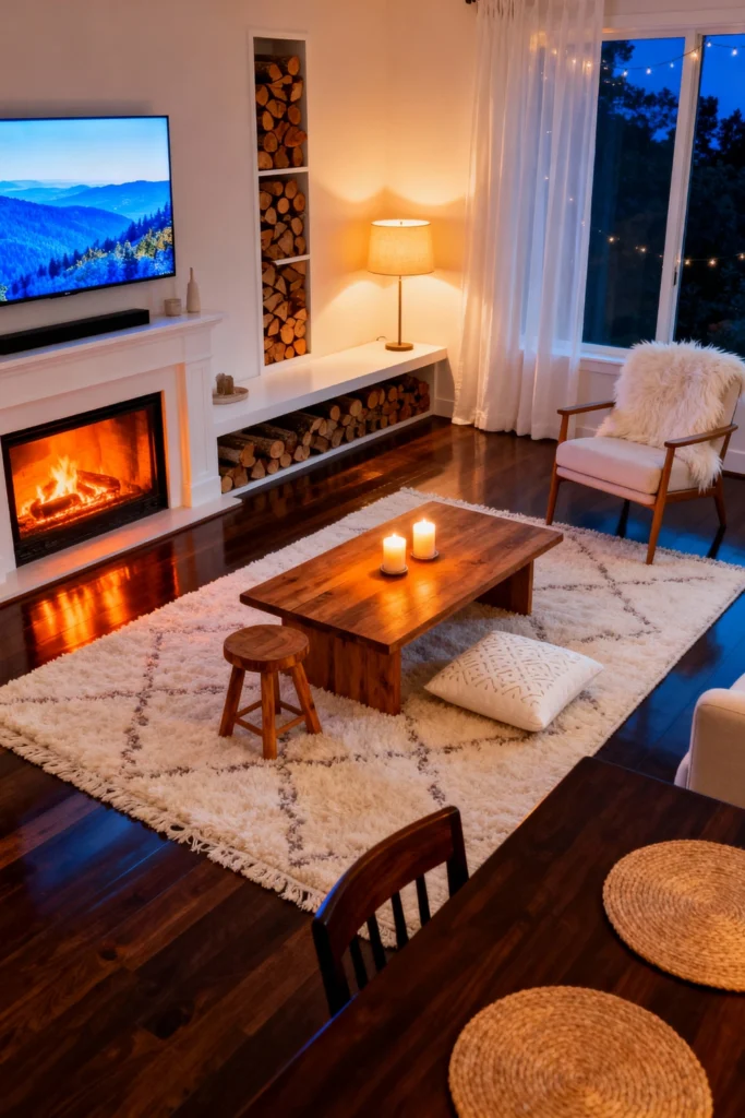 Center your room around a warm, roaring fireplace. Build tall, vertical niches into the wall to neatly stack your firewood—it acts as rustic decor! Lay a large, plush Moroccan-style rug over your dark hardwood floors. Opt for a solid, live-edge wooden coffee table to enhance the cabin feel. Place a mid-century wooden armchair with a fluffy white throw pillow near the window. Light a couple of thick candles on the table to echo the fire’s warmth.