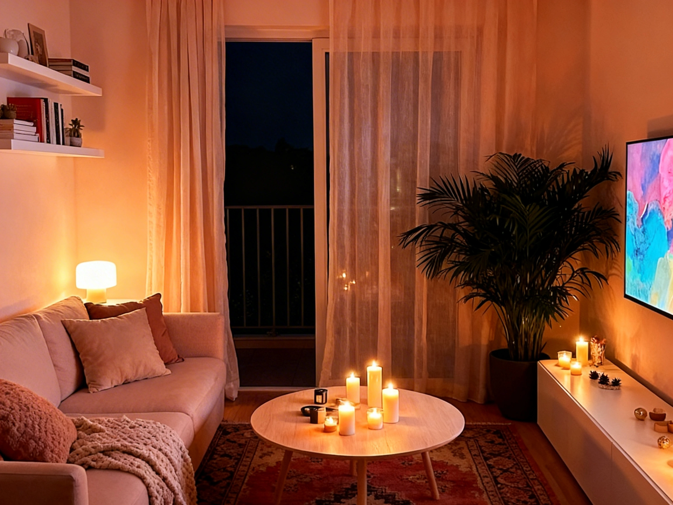 Create the ultimate relaxing evening vibe by turning off the overheads and relying on warm, glowing light. Scatter an array of pillar candles on your round wooden coffee table. Choose a soft, pinkish-beige sofa and drape a heavy knit throw over the cushions. Lay down a vintage-style red patterned rug to warm up the floor. Place a large, leafy potted palm in the corner to catch the soft shadows. Pull sheer white curtains across the door for a dreamy, diffused look.