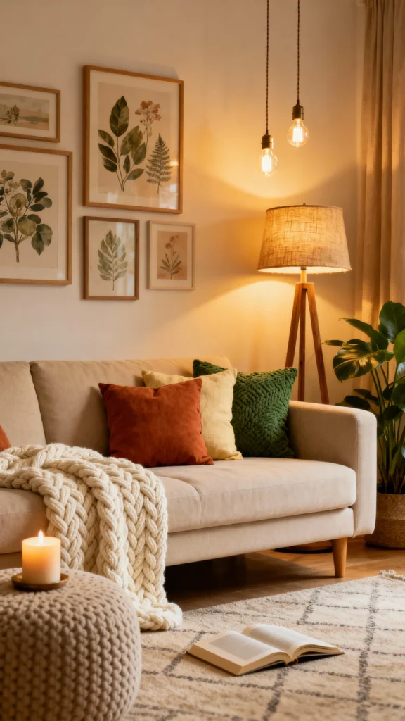 Soft lighting can truly transform your living room into a cozy retreat. Use warm lamps and flickering candles to create a gentle glow that enhances earthy shades. This warm ambiance invites relaxation and makes your space feel even more welcoming.