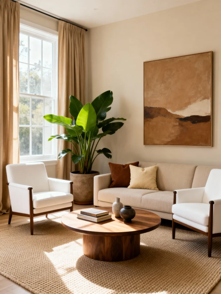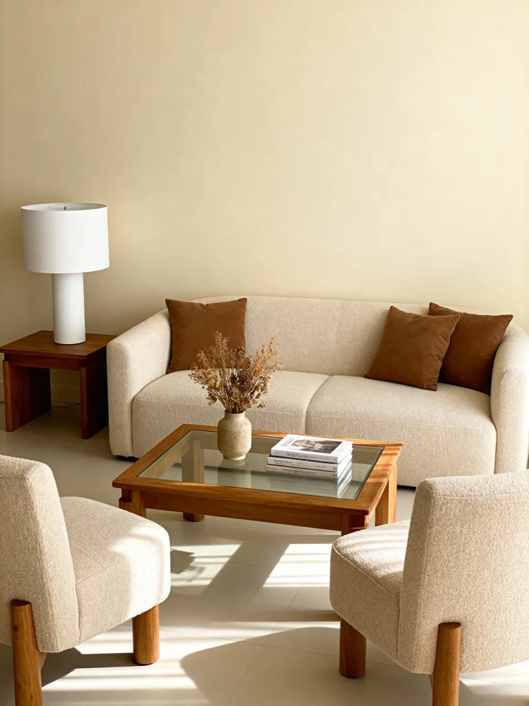 Bring the outdoors in with natural materials like wood, rattan, or stone. A wooden coffee table, a woven basket for storage, or a few potted plants can create an organic feel that’s both stylish and grounding.