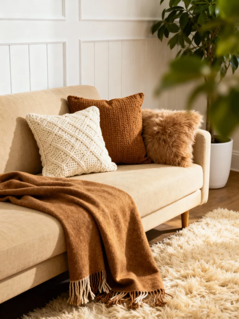 Add warmth and coziness by layering different textures. Combine soft throw blankets, plush pillows, and a cozy area rug. Mix materials like velvet, knit, and faux fur to create a tactile, inviting space.
