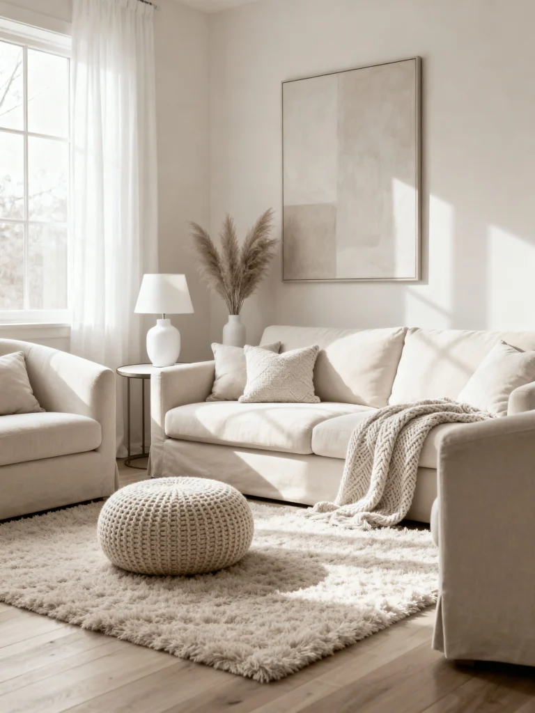 A warm beige palette creates a cozy vibe in your living room. Soft textures like plush pillows and woven baskets add depth and comfort. This combination invites relaxation and makes the space feel inviting for both family and friends.