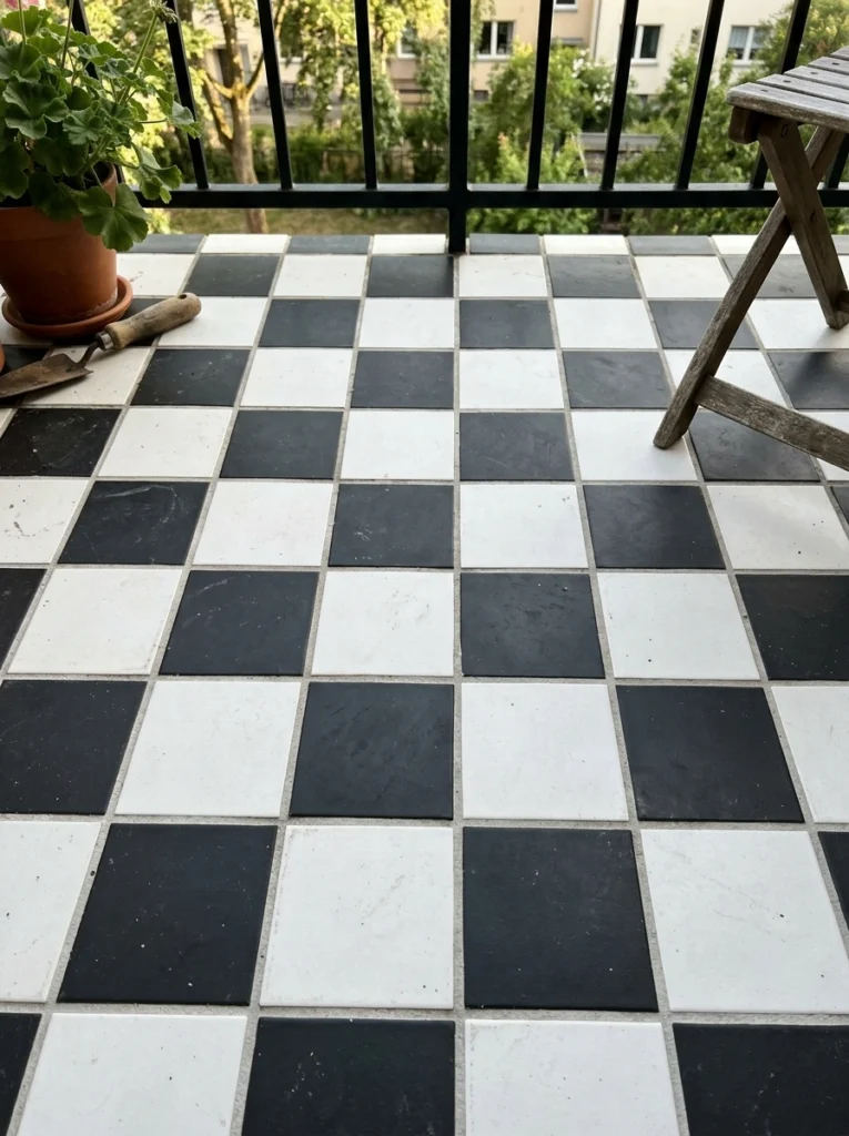 Want drama? A checkerboard layout offers that iconic black-and-white luxury contrast seen in grand European estates. It instantly elevates ordinary spaces into stylish outdoor flooring masterpieces. But a word of caution: you definitely doesn’t want to use high-gloss finishes outside. Always choose a matte finish to avoid creating a slippery, dangerous surface when it rains. Keep the furniture sleek and monochromatic to let this bold pattern do the heavy lifting.