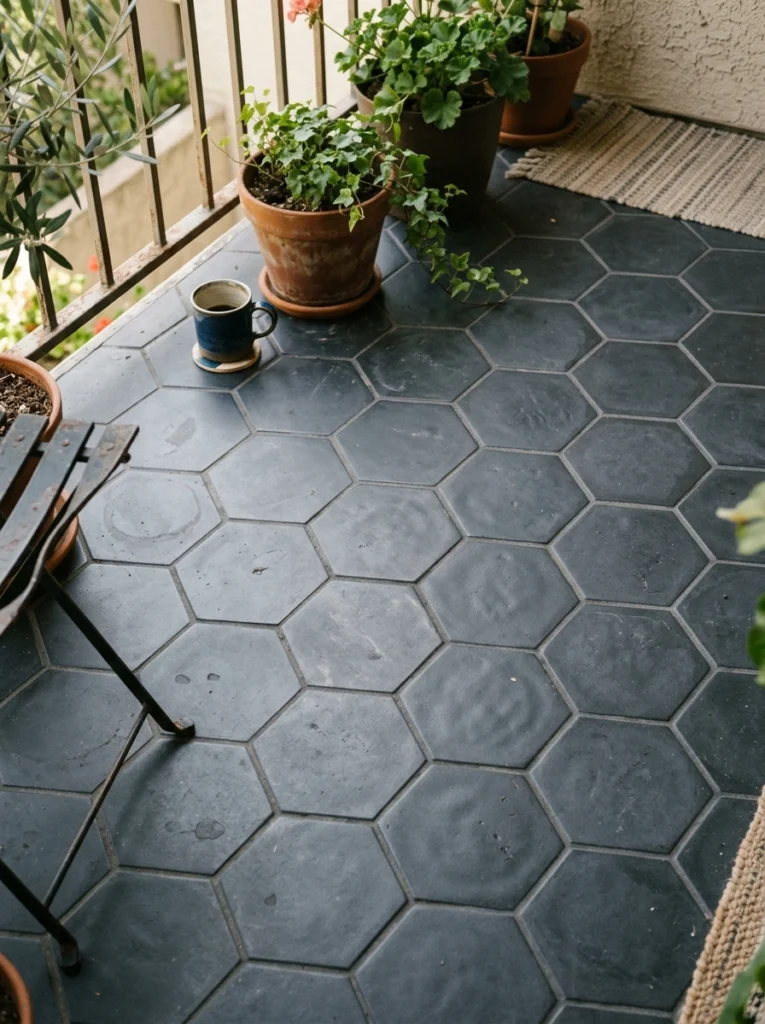 Break out of the box with hexagon tiles. A honeycomb layout immediately draws the eye and feels like a custom, expensive installation. But stick to a cohesive color palette—one major mistake is using mismatched patterns with aggressive shapes, which just looks chaotic. Try matte charcoal or soft white hexagons. The abundance of grout lines actually provides great grip, and the geometric repetition feels incredibly modern and fresh for any city balcony.