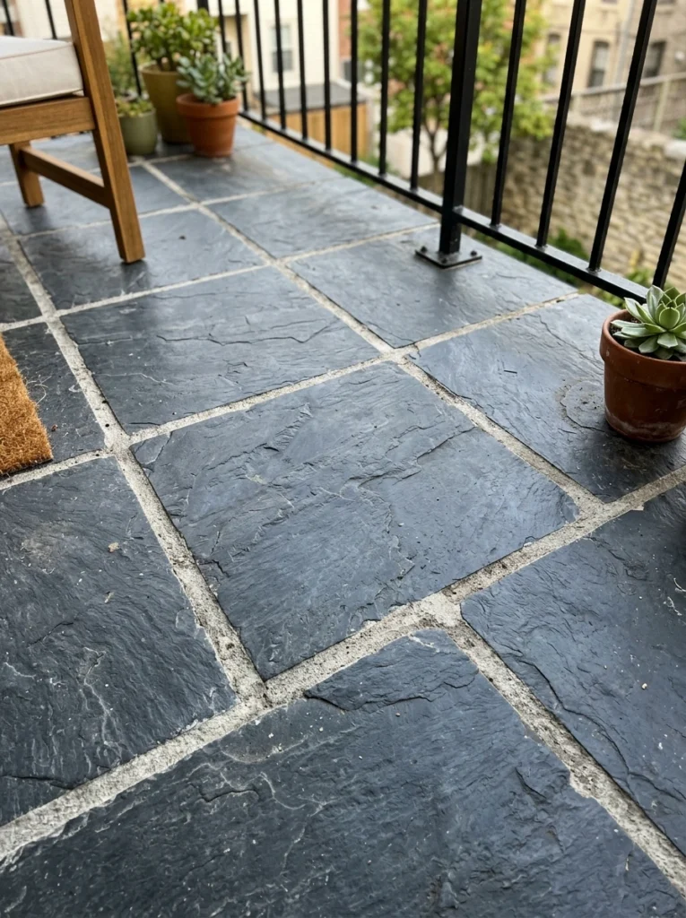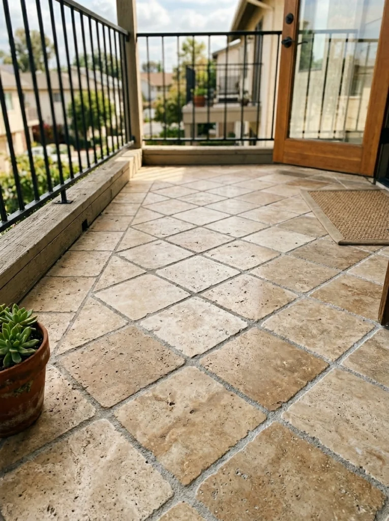 Real stone tiles just ooze wealth, don’t they? Laying them in diagonal layouts is a brilliant designer secret. Why? Because the diamond pattern breaks up the rigid boxy shape of a standard balcony, making the area feel much more expansive and dynamic. These tiles gives the space a really grounded feel. Just remember that natural stone requires proper sealing for weather resistance, but the luxurious, rugged aesthetic is totally worth the extra step.