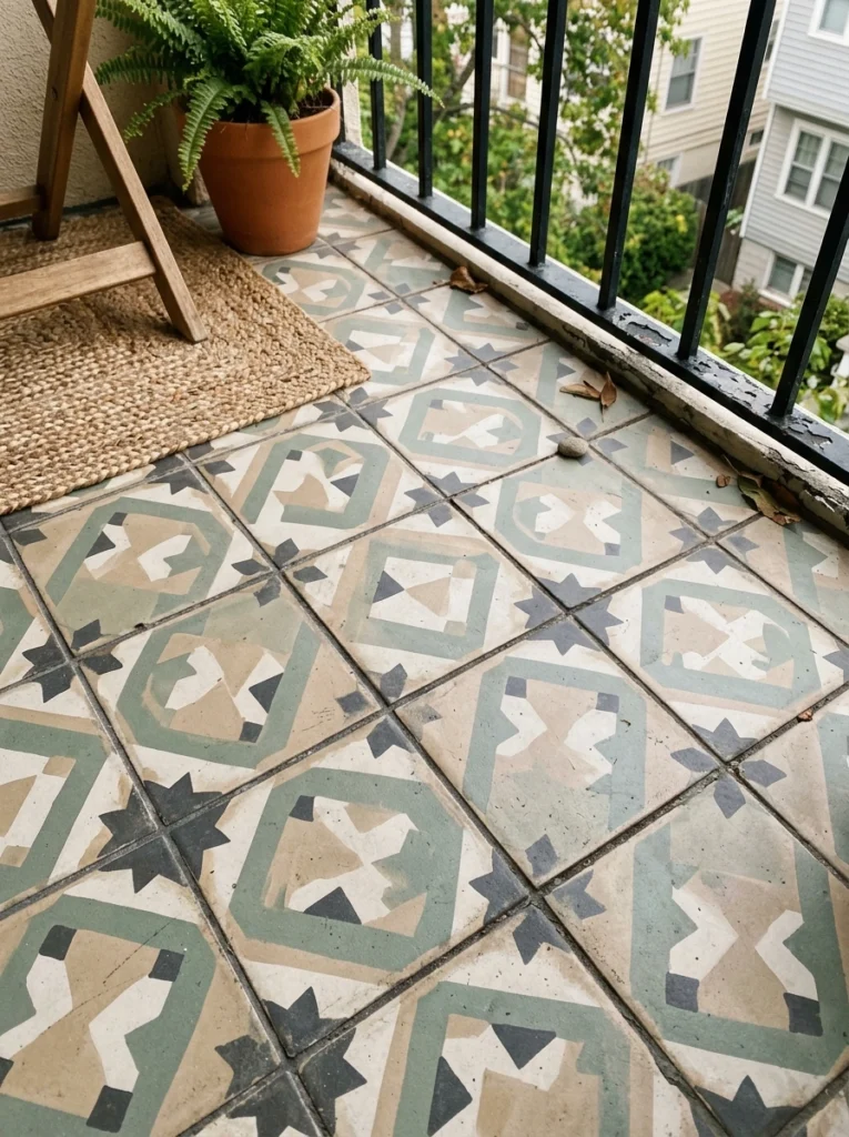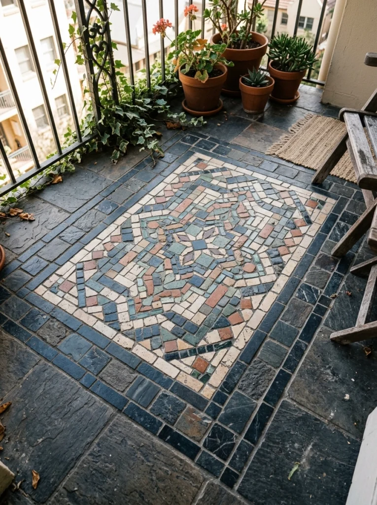 Want to mimic a high-end Roman villa? Use mosaic tiles and frame them. Mixed border framing—where you use a solid, darker tile around the perimeter and a textured mosaic in the center—creates a literal “rug” out of tile. It zones the space beautifully, which is a great strategy for a large balcony. It visually anchors your seating area, making the outdoor layout feel just as considered and finished as your living room indoors.