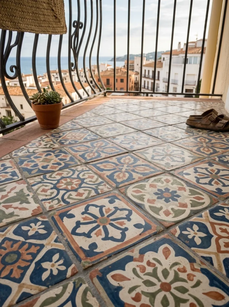 Nothing says “holiday at home” quite like patterned encaustic tiles. Opt for soft Mediterranean hues—think faded denim blues, muted terracottas, and sage greens. These colors are fantastic for small balcony makeover ideas because they draw the eye down and make the floor a striking feature. There is so many ways to arrange them, but a simple grid works best so the pattern speaks for itself. Add some terracotta potted lemon trees to finish the look!