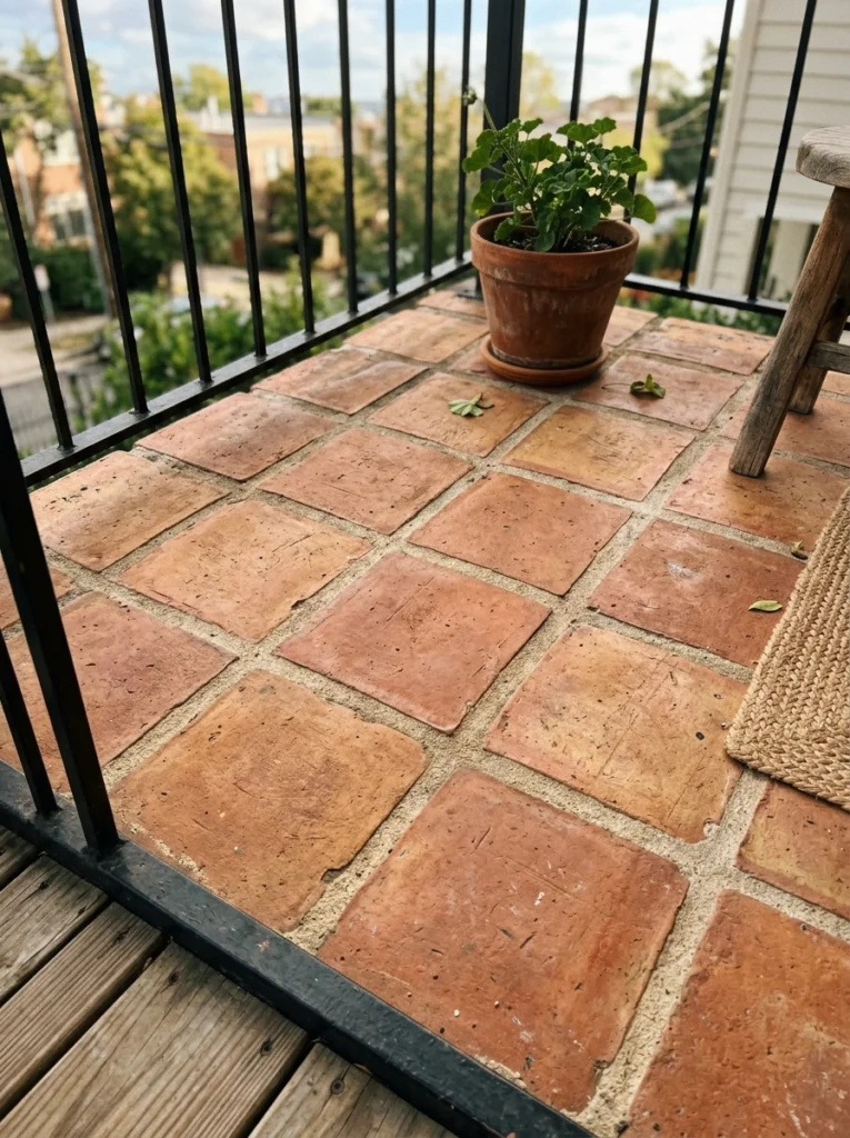 There is something deeply comforting about raw, earthy warm shades. Terracotta tiles bring a heavy, baked-clay warmth that feels very organic. Make sure you choose tiles that is meant for outdoor use so they don’t crack during a hard freeze. Also, avoid mismatched material tones—if you go with terracotta, stick to natural wood and rattan furniture rather than clashing it with ultra-modern chrome.