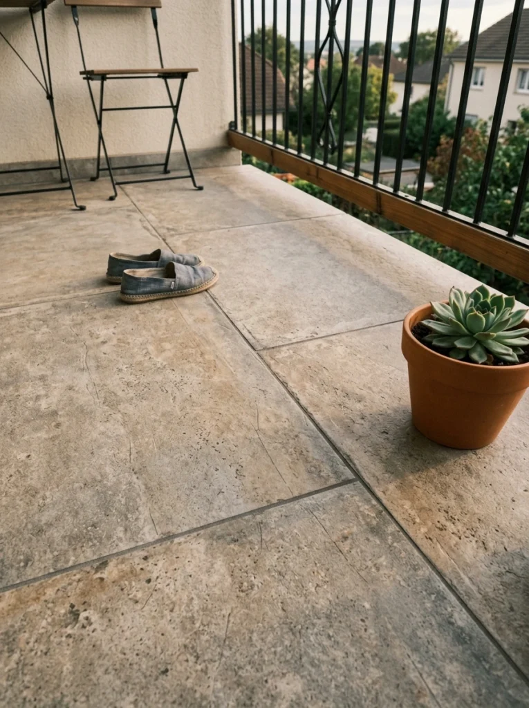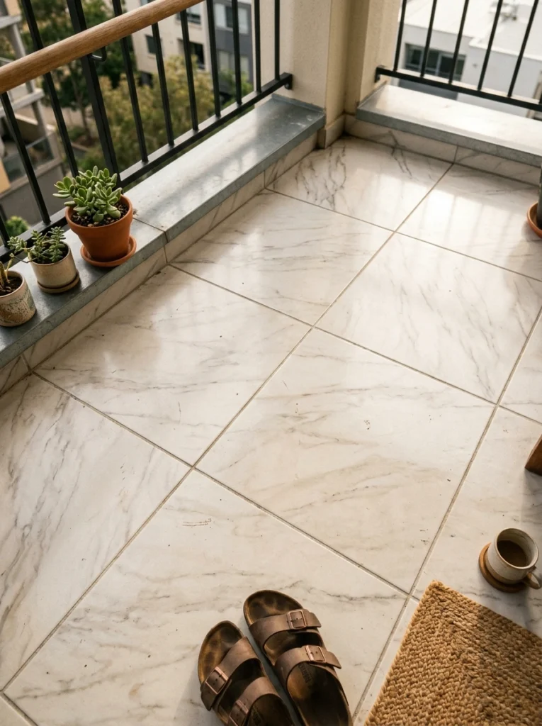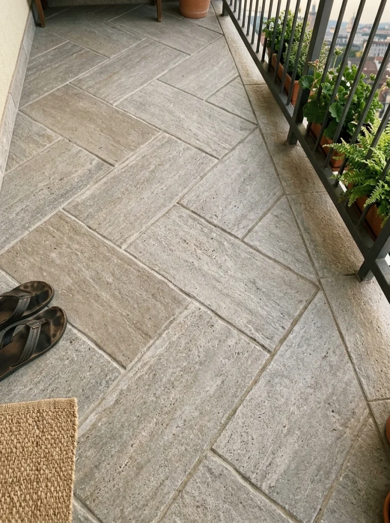 Here is a vital rule for small spaces: what NOT to do is use tiny, overcrowded patterns if you already have a lot of furniture. It just looks messy. Instead, use large-format porcelain tiles. Fewer grout lines mean the floor looks like one continuous, sweeping surface, making a tiny balcony feel vast. Just ensure you have proper drainage planning, as large tiles don’t contour to sloping balcony floors as easily as small ones do.