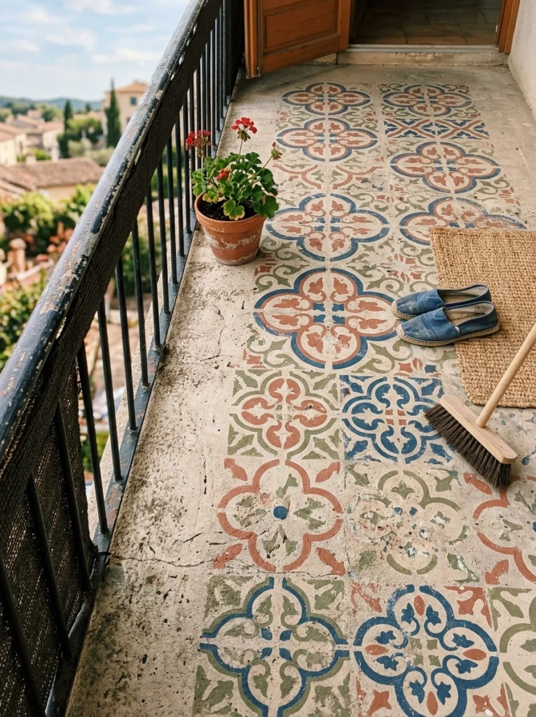 Okay, this is technically a paint job, but it gives you modern balcony design tiles on an absolute shoestring budget. If your concrete is smooth and in good shape, use an outdoor-grade masonry paint and a stencil to paint a faux-tile pattern directly onto the floor. Seal it heavily for weather suitability. It gives you the exact look of custom encaustic tiles for the price of a couple cans of paint.