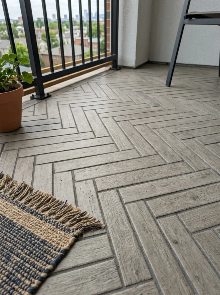 Layout patterns change everything, don’t they? Laying slim rectangular tiles in a herringbone pattern creates an illusion of movement and width. This is an epic small balcony layout strategy because the intersecting diagonal lines trick the brain into thinking the space is longer than it actually is. It works beautifully with both ceramic and wood-look tiles.