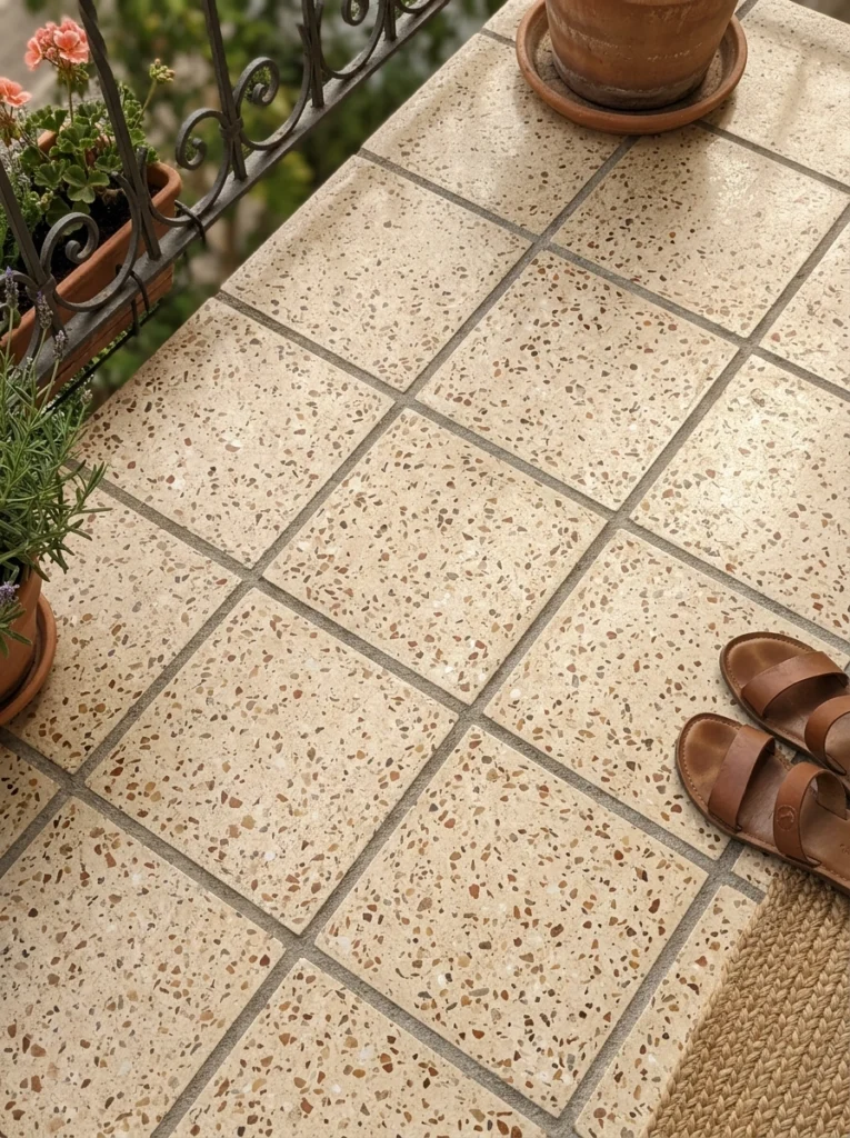 Terrazzo is having a massive moment in terrace flooring design. Look for tiles with earthy warm shades and neutral tones to keep things feeling organic rather than overly busy. The scattered flecks of marble and glass embedded in the tile naturally hide dirt and dust, making it surprisingly low-maintenance.
