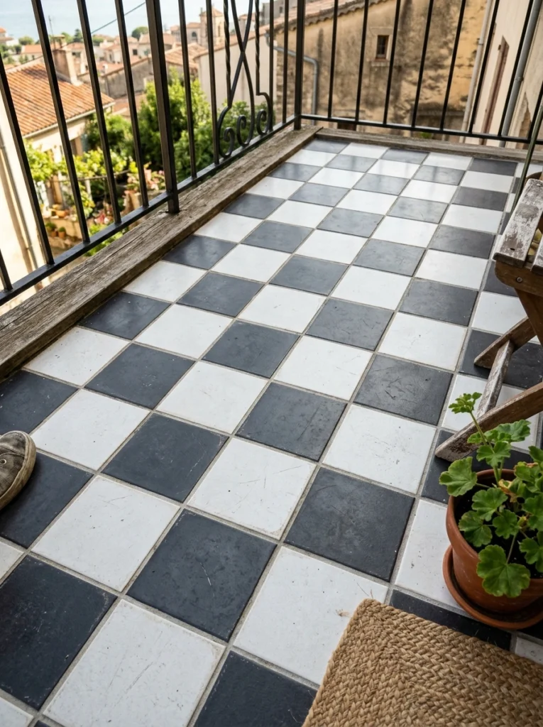Feeling bold? A classic black and white checkerboard pattern never goes out of style. Its incredible how much larger a balcony feel when you use bold contrast like this. This layout brings a Parisian cafe energy right to your home. Just keep the surrounding decor simple—minimalist black metal chairs and crisp white cushions are all you need.