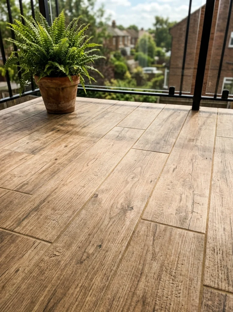 Love the look of wood but hate the maintenance? Wood-effect porcelain tiles are your best friend. They bring intense warmth to an outdoor space without the risk of rotting or splintering in the rain. Plus, porcelain is incredibly durable and inherently slip-resistant if you get a textured finish. Pair these with a neutral woven rug and some warm string lighting, and you’ve got a cozy cabin vibe right outside your door.