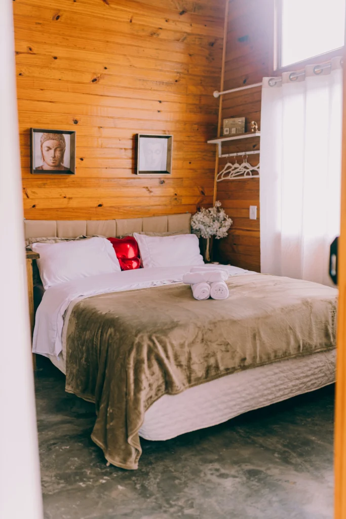 This room is the definition of rustic charm and coziness! The rich, warm wood paneling on the walls brings immediate texture and a cabin-like feel. The bedding is kept light and fluffy, topped with a gorgeous, velvety brown throw that practically begs you to snuggle up. The small, framed art pieces and the roll of towels add those perfect, thoughtful touches.