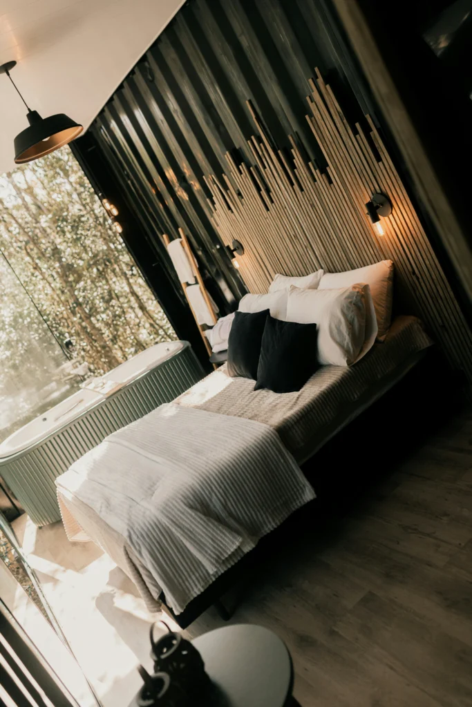 This is a dreamy, high-contrast getaway! The combination of dark walls and the natural wood slats behind the bed creates a super dramatic, modern-meets-nature look. The texture of the slats—which looks like abstract art—is fantastic, and the light from the large windows makes the whole room glow. That tub next to the bed? Pure luxury.
