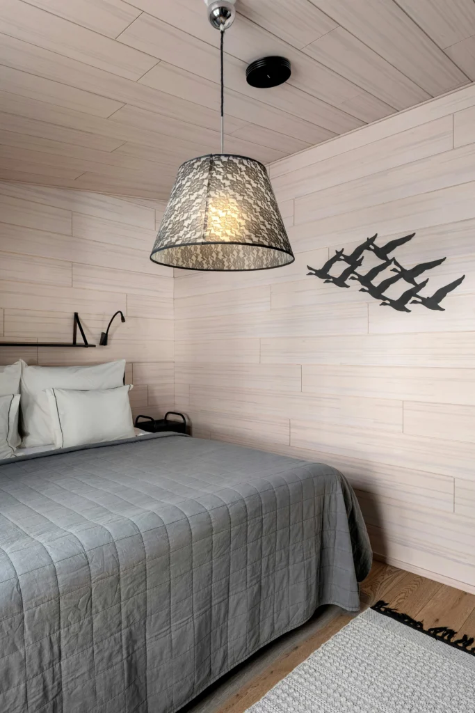 I absolutely love the light and airy Scandinavian-meets-coastal vibe here! The subtle, horizontal whitewashed wood paneling on the walls and ceiling creates incredible texture without making the room feel dark. The simple, dark grey bedding and that cool, textured pendant light perfectly ground the space, while the flying geese art adds a touch of nature.