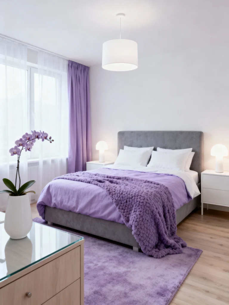 This lilac bedroom is so soft and serene, making it the perfect peaceful retreat. The monochromatic look uses different shades of lavender and light grey for a sophisticated yet airy feel. Everything—from the walls to the bedding and rug—works together beautifully.