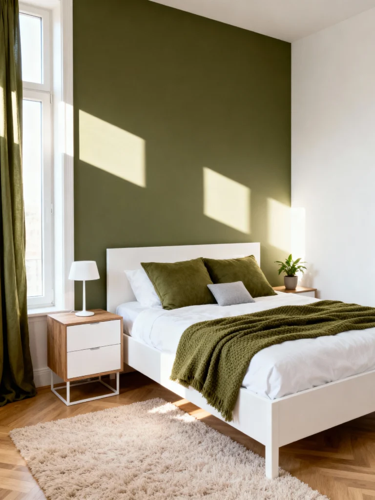 Talk about grounding! The deep olive green accent wall paired with the light wood floor and natural rug creates a truly earthy, restful retreat. The subtle texture in the throw blanket and the use of white in the furniture keeps the look fresh and modern. It’s the perfect blend of nature and style.
