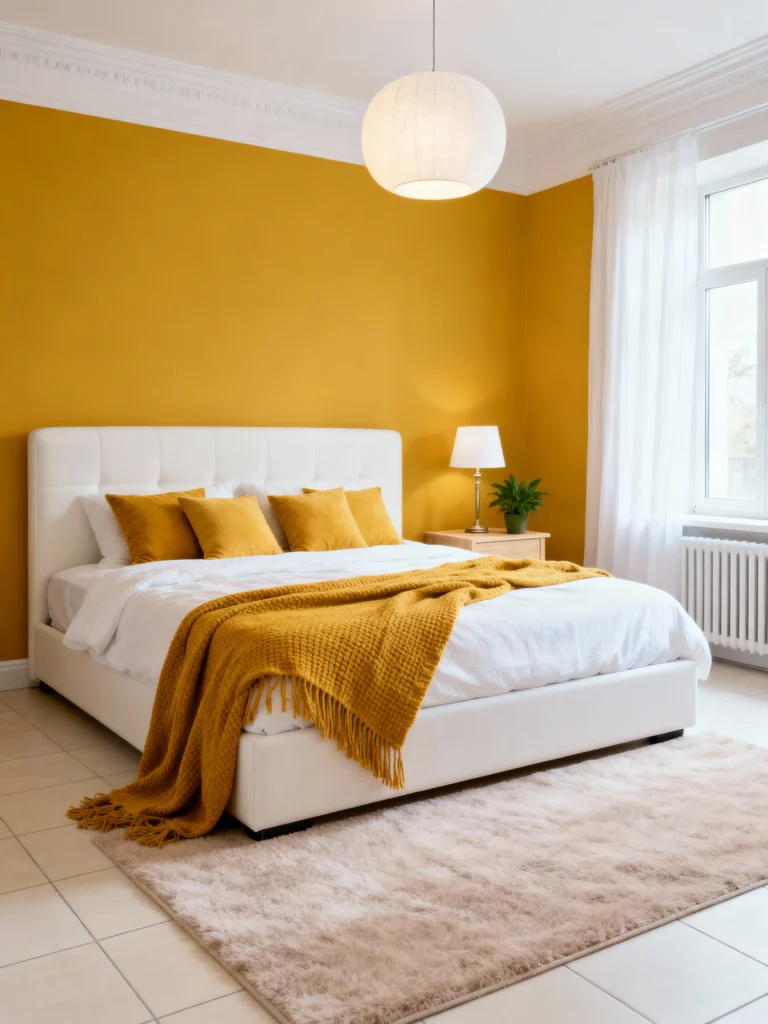 • Crisp Contrast: Keep all major furniture and bedding bright white to provide a clean, fresh contrast against the warm accent wall.