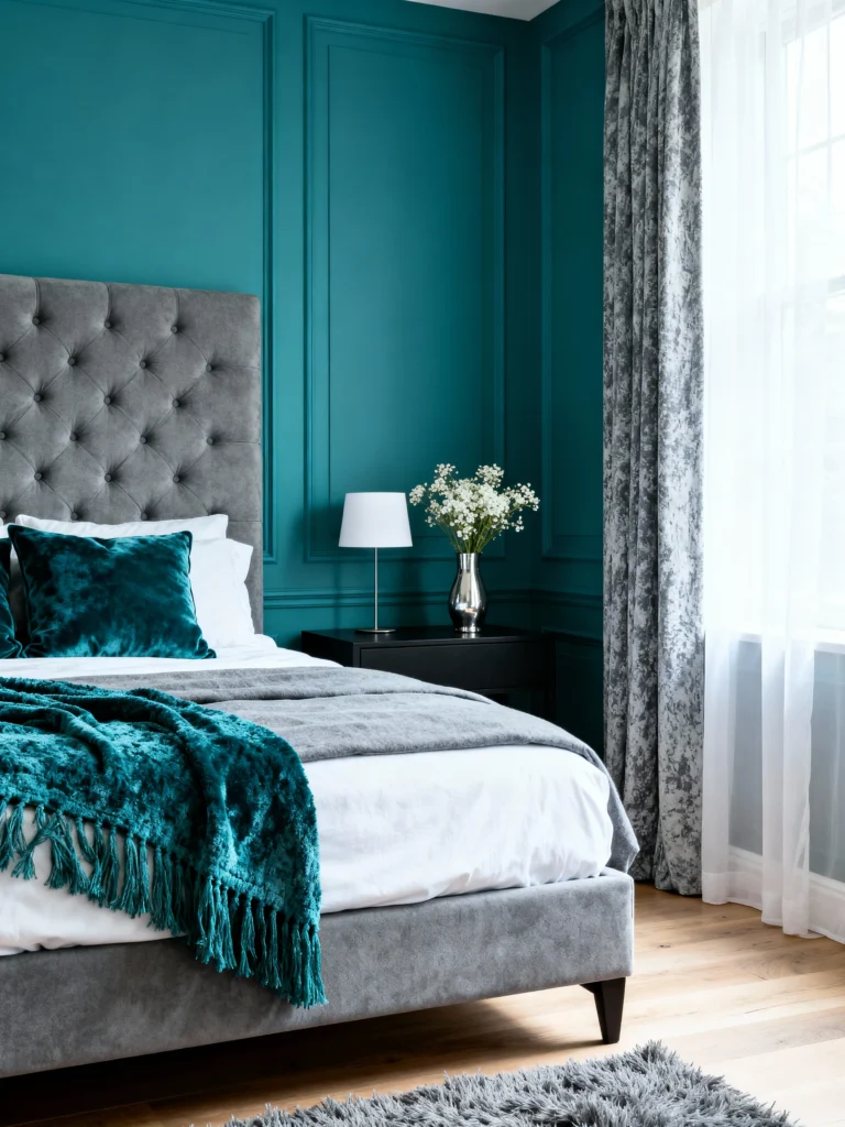 The deep teal wall in this bedroom is absolutely gorgeous, providing a dramatic backdrop for the lighter gray headboard and duvet. The geometric wall paneling adds an extra layer of visual interest and texture. This color combination is simultaneously calming and incredibly chic.