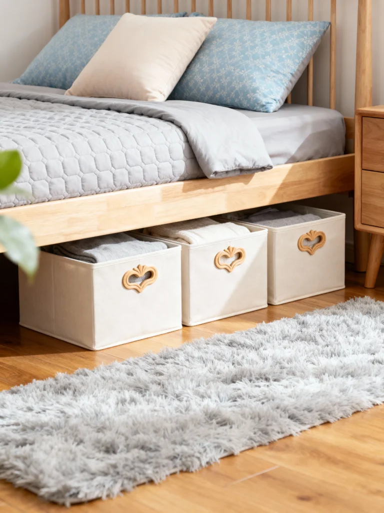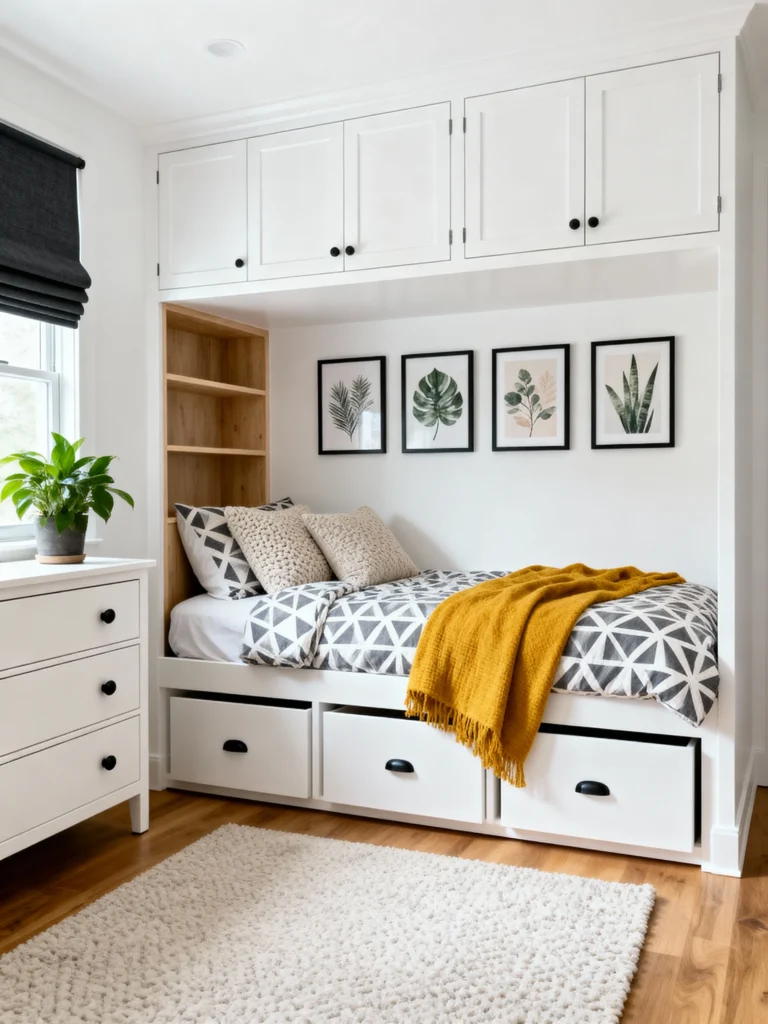 Under-bed storage is a smart way to make the most of your small bedroom. Storing items in bins or boxes under your bed keeps your space tidy and gives you extra room to move around. Plus, it’s a simple solution to keep your belongings organized and out of sight!