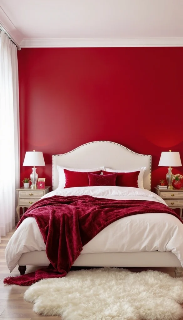 - Balance with white: A white headboard and duvet keep the deep red from feeling too heavy.