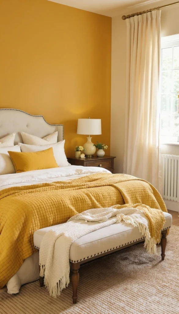 If you love warm colors but want something softer than bright yellow, this mustard-yellow tone is your answer. It radiates warmth and sophistication. The chunky knit throw and bench at the end of the bed add texture, making it feel layered and welcoming. This is an elegant twist on a sunny color palette.