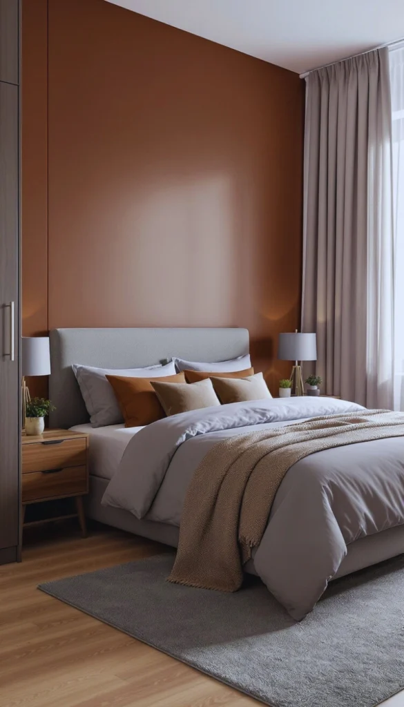 This bedroom embraces a sophisticated, modern-earthy vibe. The rich, rust-colored accent wall creates a strong focal point and pairs beautifully with the cool gray bedding. It’s a mature, calming color scheme. The minimalist wood nightstands and simple gray throw tie into the contemporary look.