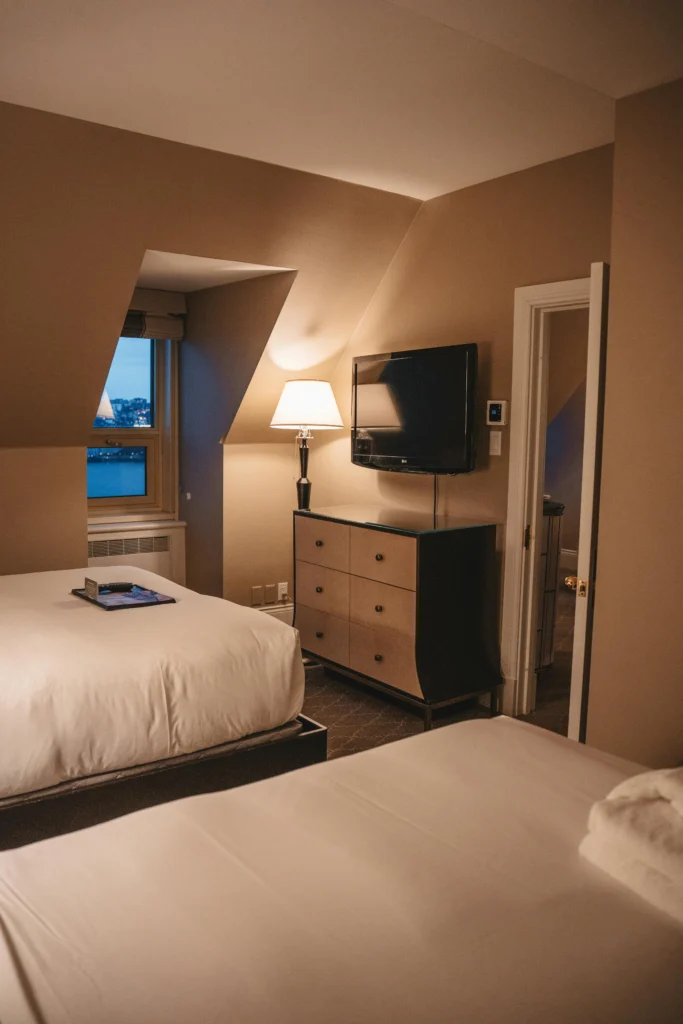 Here’s how to introduce color and pattern to a neutral hotel room! The bright blue and yellow throw blanket and accent pillows instantly provide a sophisticated pop of personality. The dark wood paneling and large mirror panels add a sleek, modern background, letting the bedding stand out.