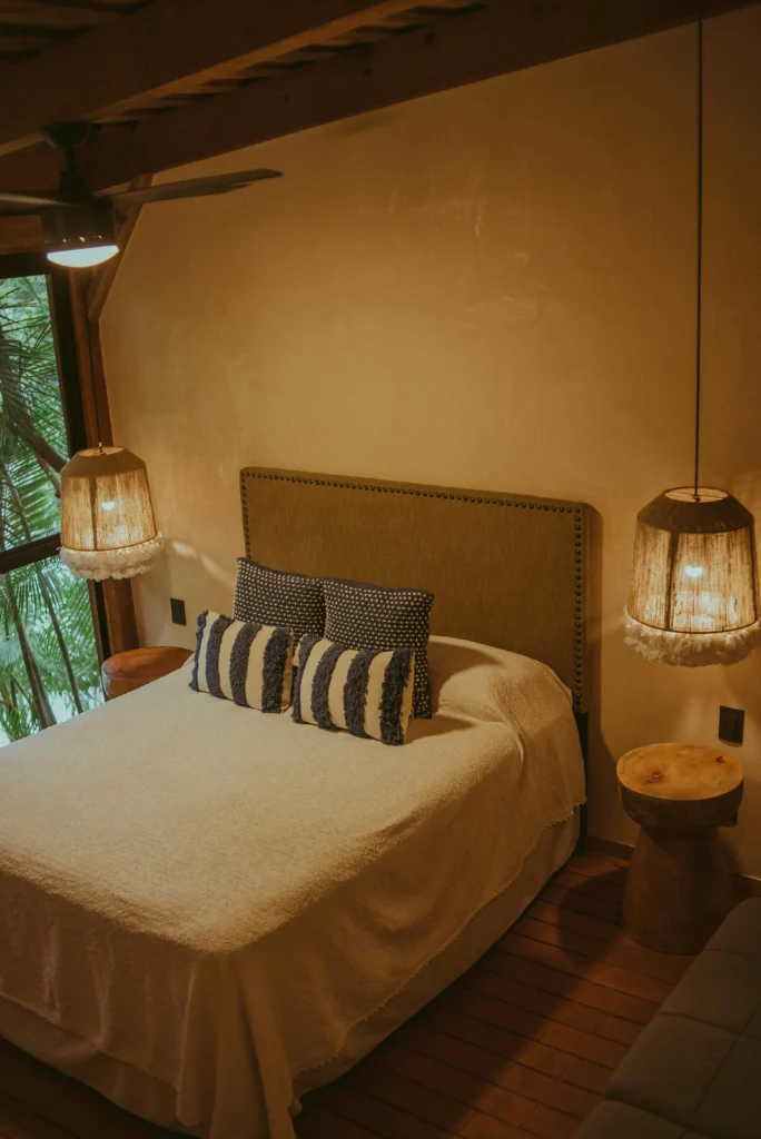 This style is a total vacation vibe! It blends rustic wood, natural textures, and a cozy color palette for a boutique retreat feel. The chunky woven light fixtures with fringe and the raw wood side tables bring in a beautiful, natural, bohemian element. It feels like a treehouse!