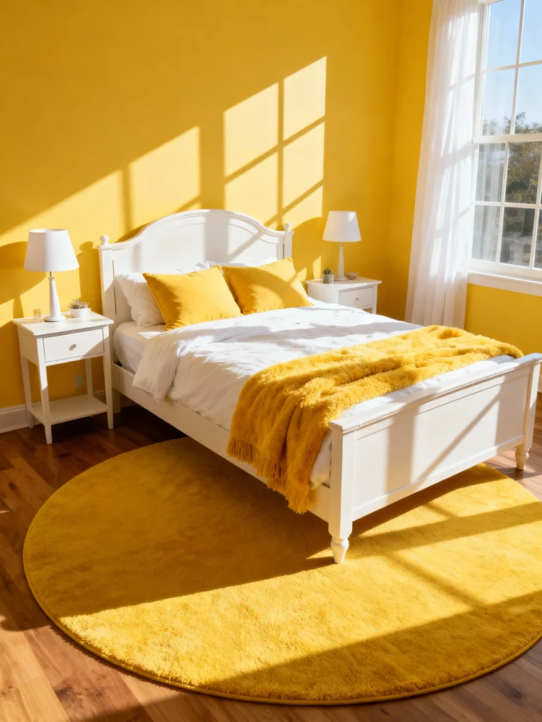 This vibrant yellow is pure joy! It’s an instant mood booster, especially when paired with crisp white bedding and a clean white bed frame. The matching yellow circular rug and throw blanket tie everything together without being overwhelming. This style is perfect if you want to wake up feeling energized and happy every day.
