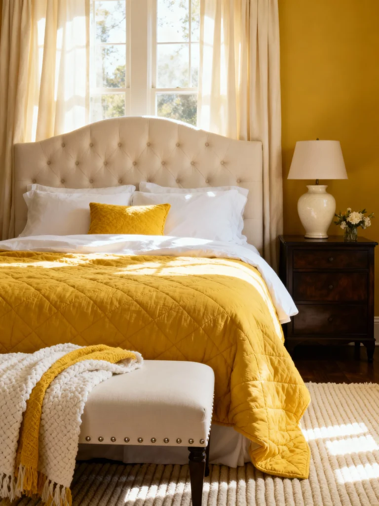 If you love warm colors but want something softer than bright yellow, this mustard-yellow tone is your answer. It radiates warmth and sophistication. The chunky knit throw and bench at the end of the bed add texture, making it feel layered and welcoming. This is an elegant twist on a sunny color palette.