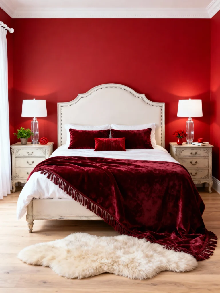 Talk about drama! This bedroom uses a deep, rich cranberry red to create an incredibly luxurious and intimate atmosphere. The plush velvet throw blanket and shaggy white rug scream comfort. Paired with a tufted headboard, it has a classic, romantic feel—perfect for a cozy winter retreat.