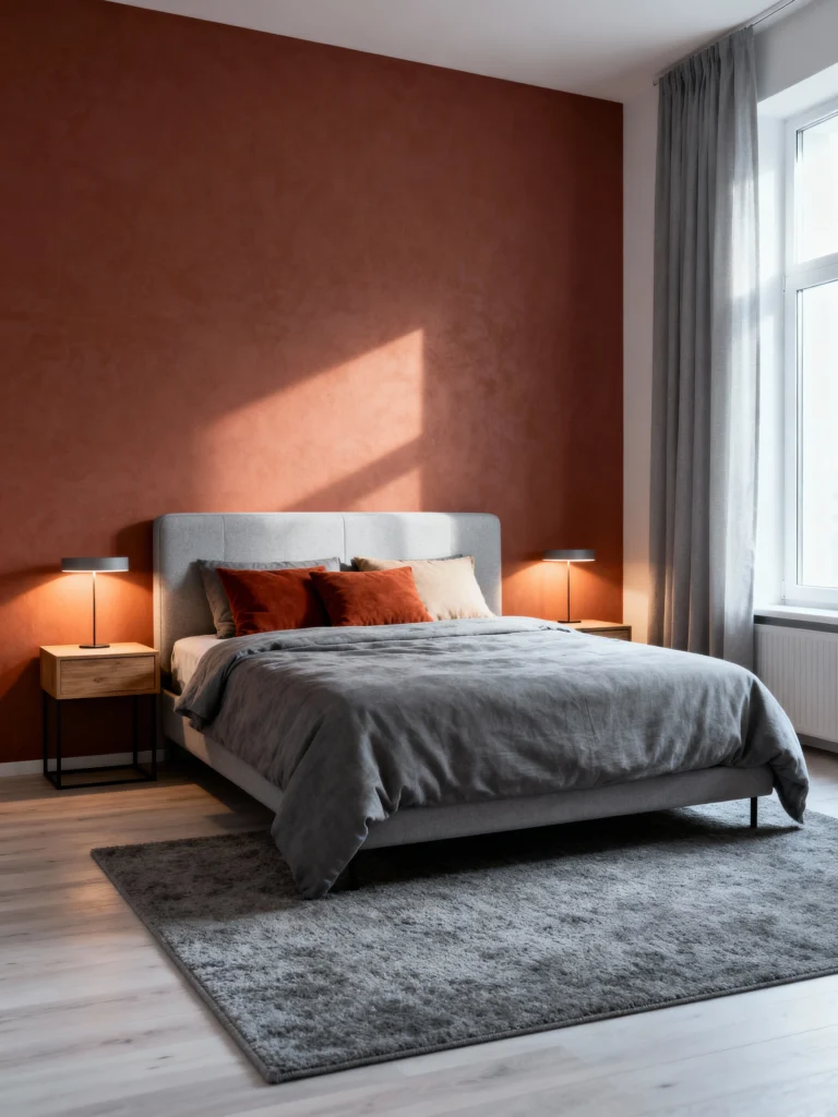 This bedroom embraces a sophisticated, modern-earthy vibe. The rich, rust-colored accent wall creates a strong focal point and pairs beautifully with the cool gray bedding. It’s a mature, calming color scheme. The minimalist wood nightstands and simple gray throw tie into the contemporary look.