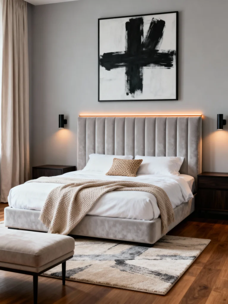 Adding a bold piece of wall art can completely change the vibe of your bedroom. Choose something that reflects your style and makes a statement, like a striking black-and-white piece. This way, your wall art not only enhances your decor but also sparks conversation and draws the eye in a cozy and inviting space.