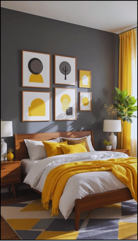 This bold room uses color blocking to perfection! The combination of charcoal grey and sunny yellow is vibrant and energetic. It’s a great example of updating a mid-century modern foundation (the sleek wooden bed frame and nightstands) with a powerful, modern color palette. The gallery wall with abstract shapes in the two main colors ties the whole look together brilliantly.