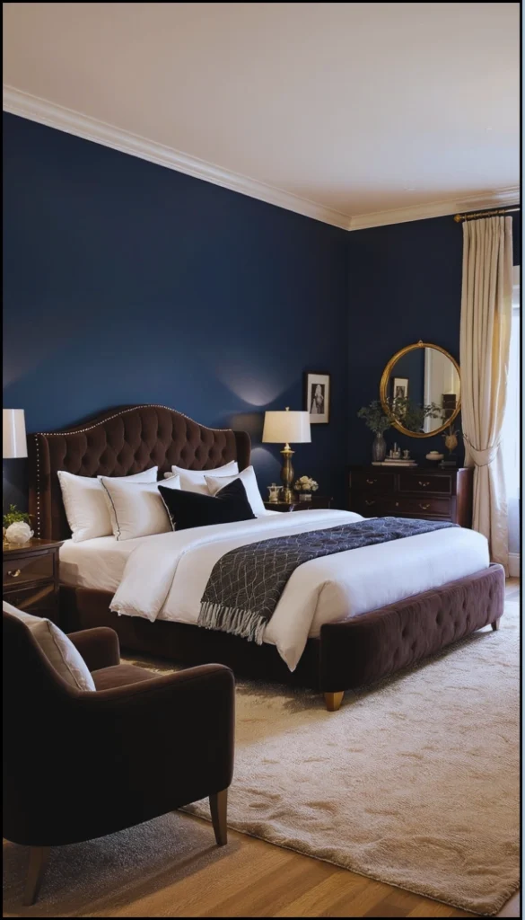 This bedroom is all about luxurious, dramatic glam. The deep navy walls set a sophisticated, moody backdrop for the rich dark-brown velvet upholstered bed and accent chair. The gold accents—the mirror, the lamp bases—add a layer of opulence. This is a perfect look for anyone who wants their bedroom to feel intimate, cozy, and utterly luxurious.
