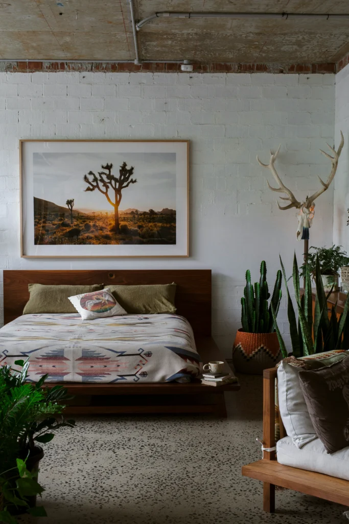This room perfectly captures that cool, earthy Southwestern boho aesthetic. The large, striking desert print above the bed immediately draws your eye and sets the theme. Paired with a patterned blanket, simple wooden platform bed, and tall, sculptural plants like the cactus and snake plant, it creates a laid-back, artistic vibe. The exposed brick and concrete floor add a great industrial edge, too.