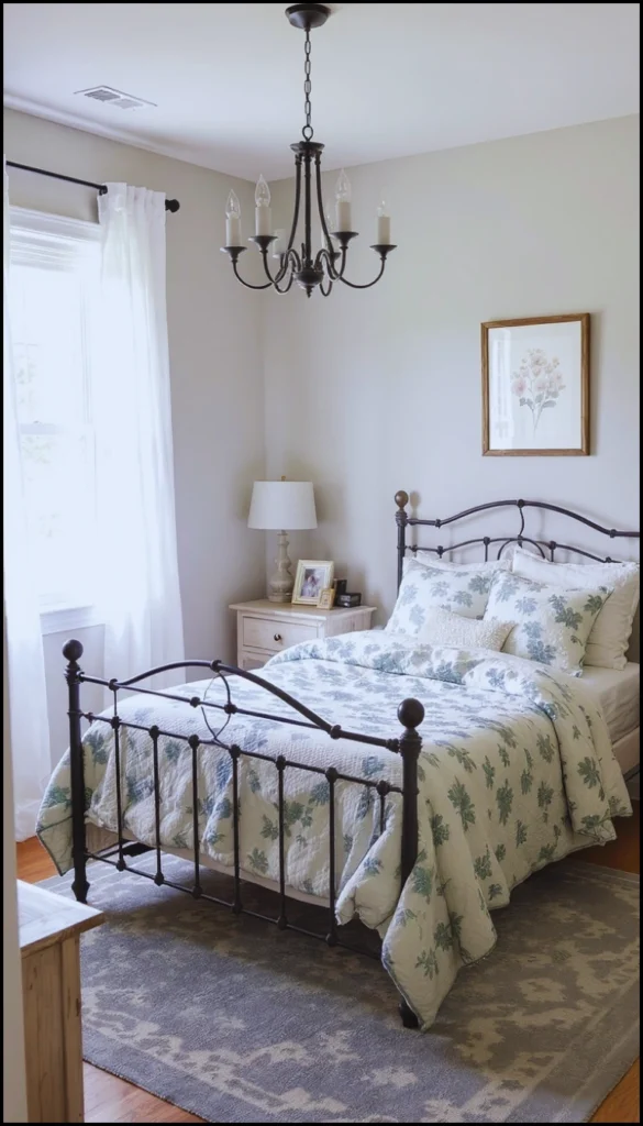- Wrought Iron: Choose a dark wrought-iron bed frame to anchor the room.