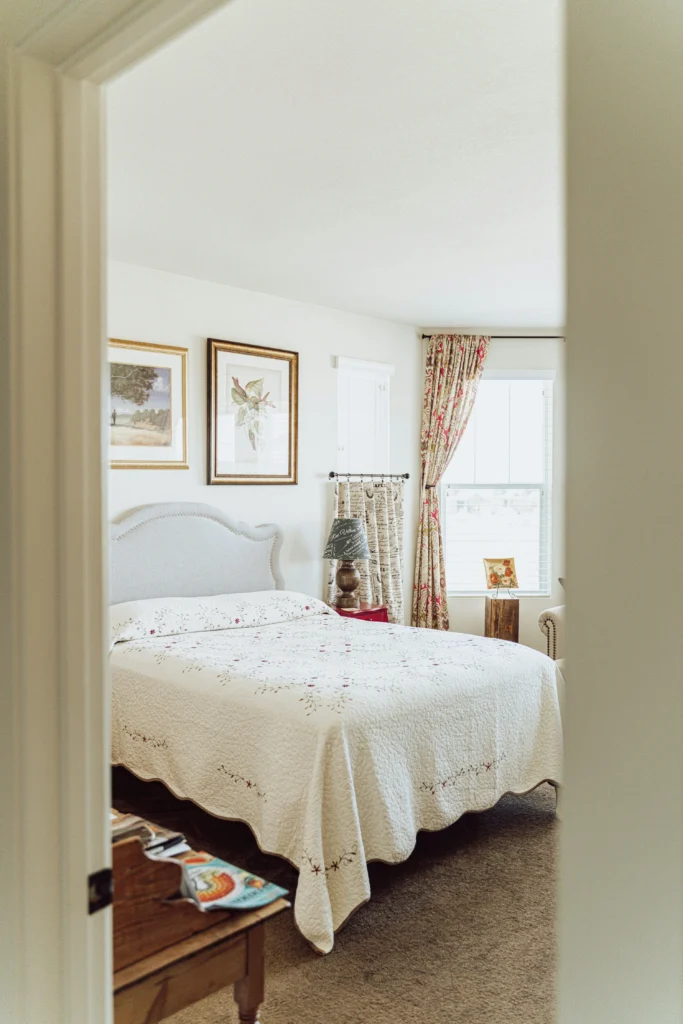 This room feels like a lovely, welcoming guest room at a family home—warm and classic. The small-scale floral print on the curtains is the main event here, providing a pop of color and personality. It’s a very traditional look, using classic framed art, a simple quilted bedspread, and a tufted headboard. The overall feeling is one of comfort and timeless familiarity.
