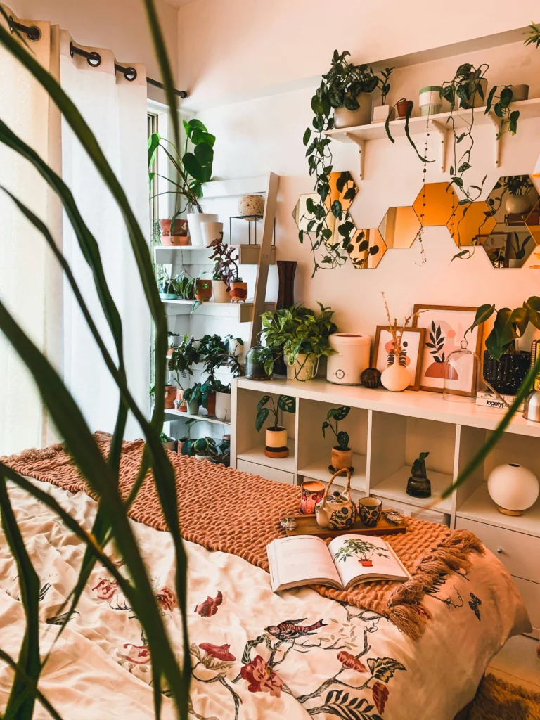 This room is an absolute dream for plant lovers! The white walls and light-colored textiles create the perfect bright canvas, making the lush greenery the star of the show. The varied textures—from the chunky knit throw to the hexagonal mirrors—add so much depth, and the warm, golden light makes everything feel cozy and inviting. It’s a true escape from the city right inside your apartment.