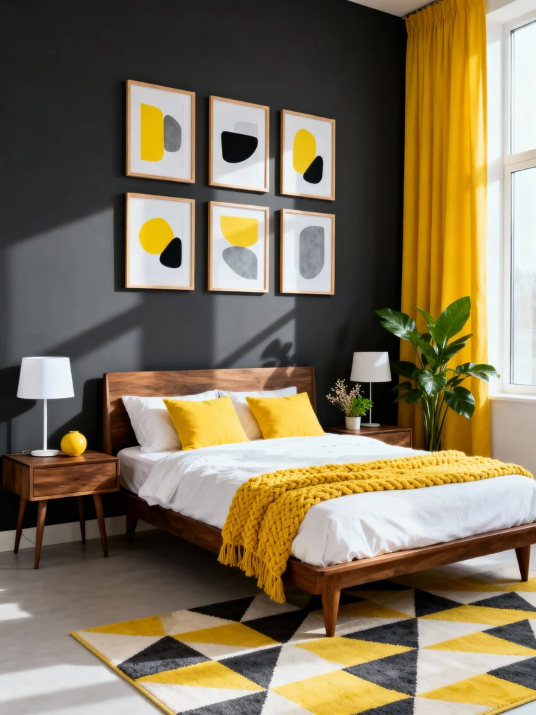 This bold room uses color blocking to perfection! The combination of charcoal grey and sunny yellow is vibrant and energetic. It’s a great example of updating a mid-century modern foundation (the sleek wooden bed frame and nightstands) with a powerful, modern color palette. The gallery wall with abstract shapes in the two main colors ties the whole look together brilliantly.