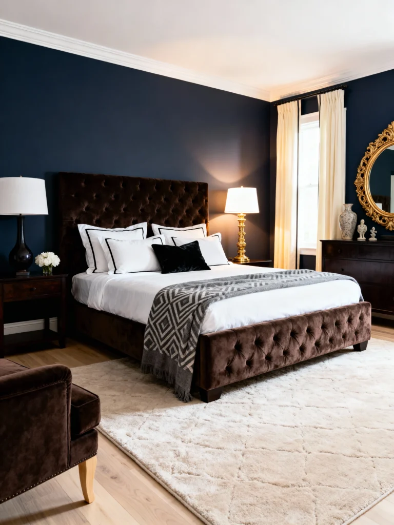 This bedroom is all about luxurious, dramatic glam. The deep navy walls set a sophisticated, moody backdrop for the rich dark-brown velvet upholstered bed and accent chair. The gold accents—the mirror, the lamp bases—add a layer of opulence. This is a perfect look for anyone who wants their bedroom to feel intimate, cozy, and utterly luxurious.