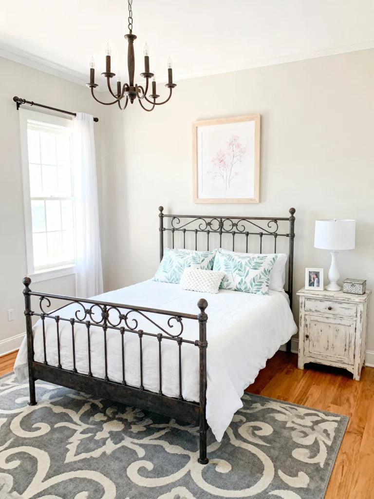 - Wrought Iron: Choose a dark wrought-iron bed frame to anchor the room.